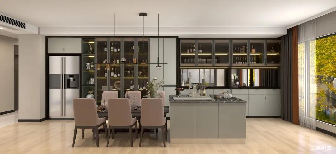厨房定制设计多功能厨柜,搭配防滑地砖,从设计造型上摒弃传统橱柜的花哨装饰,色彩搭配简约时尚,人性化功能布局,既有收纳区,也有展示区,呈现出利落干净的秩序层次,满足空间的储物需求,也创造了空间规划与视觉美的双重展现。